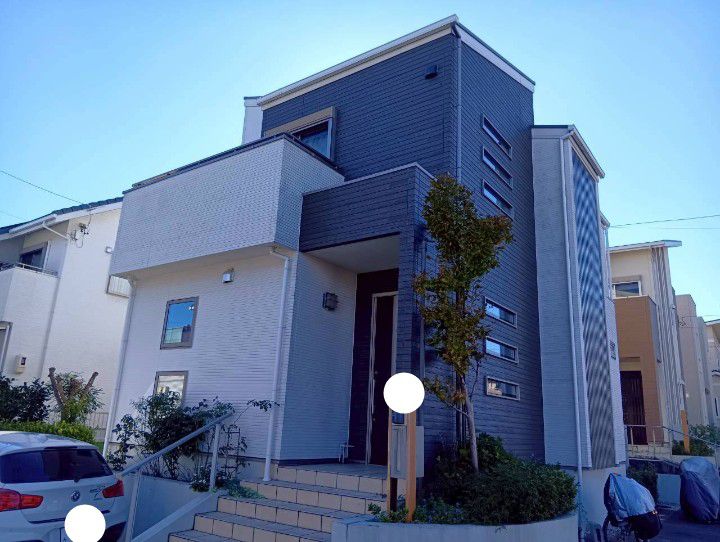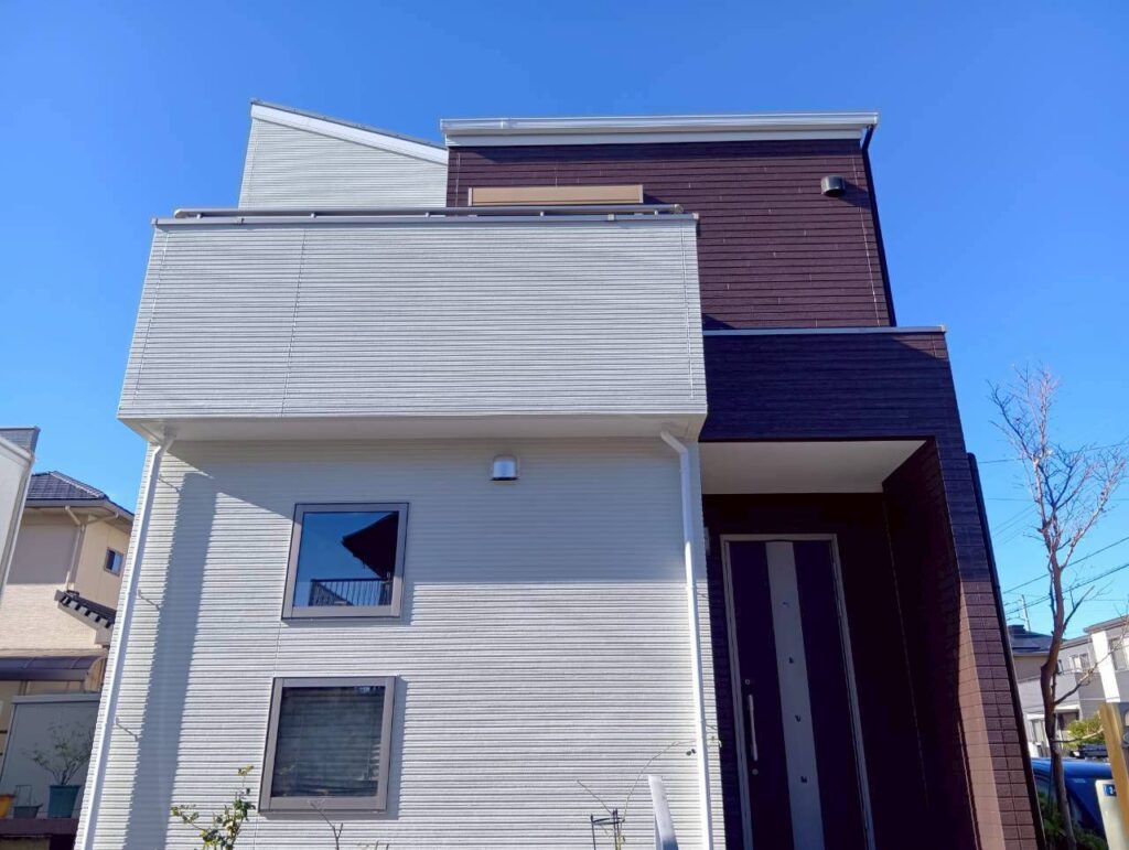 軒が出ていないためお宅で、外壁に直接当たり劣化することを懸念されていました。また、大きな格子が外壁に取り付けられており、その下を塗装できるか心配されていました。