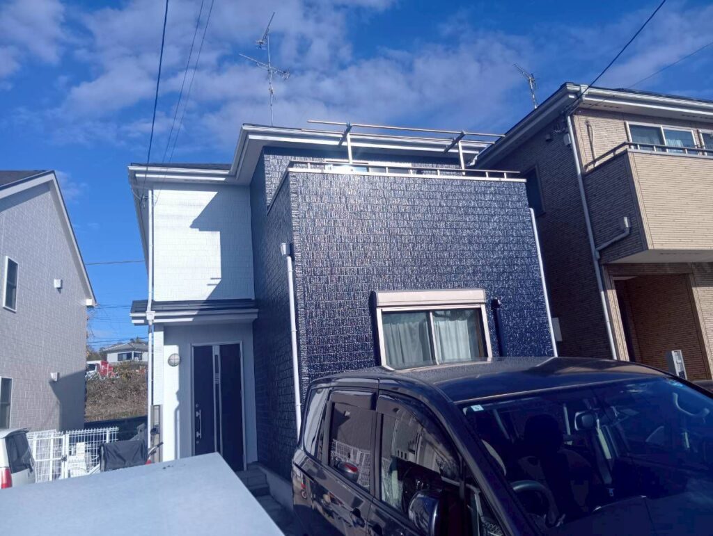正面は広い駐車スペース、裏は軌道で大変日当たりが良いことに加え、風の通り道となっているため外壁への影響を心配されていました。この度、高耐久塗料でしっかりと保護させていただきました。