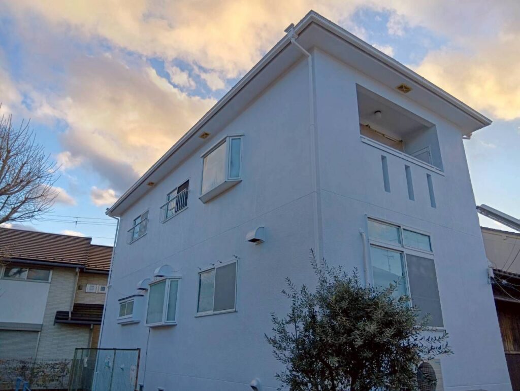 モルタル壁にクラックが目立ち始め、前回の塗装が落ち始めており、この度ご縁をいただきました。思った色に仕上がったと喜んでいただきました。